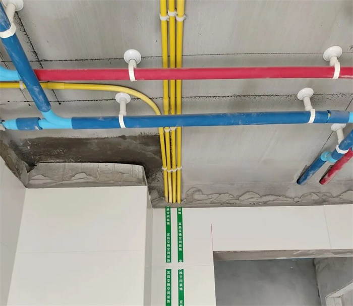 △水管排布感觀橫平豎直,墻體線槽內給水管只能用整管,不允許用直接連接,合格。